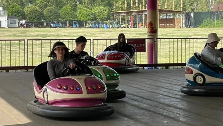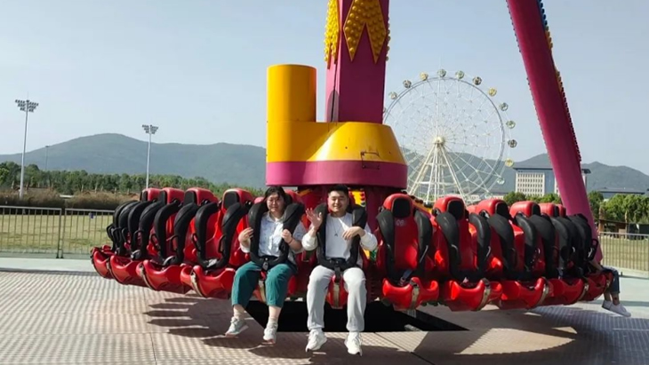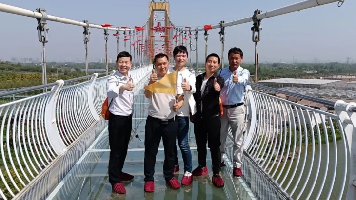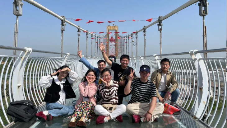午后升溫的烈日下,完成競(jìng)賽的成員三五成群的來(lái)到游樂(lè)設(shè)施區(qū)域。最火爆的項(xiàng)目非“鵲橋”——高空玻璃棧道莫屬。